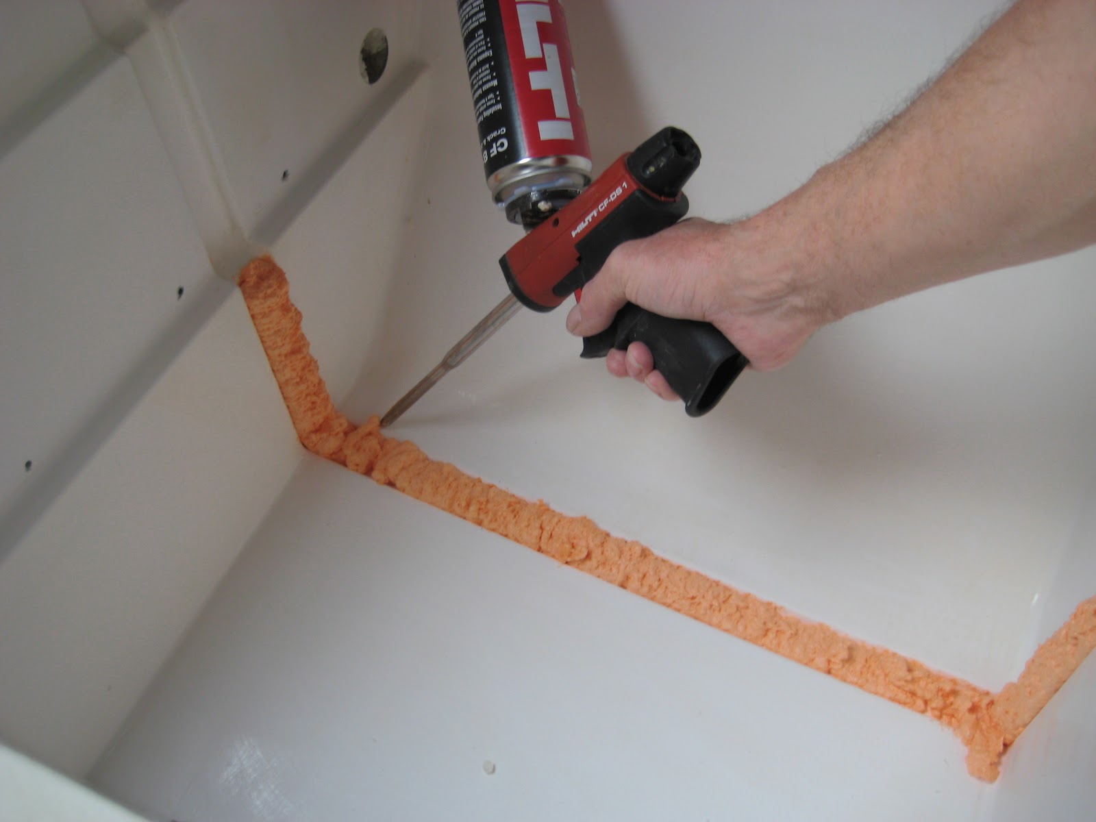 While we were in the locker drilling the new plumbing hole we filled the old one with foam. Gotta love that Hilti foam gun!